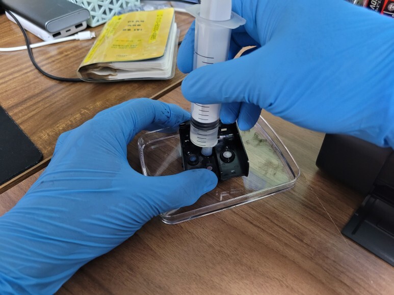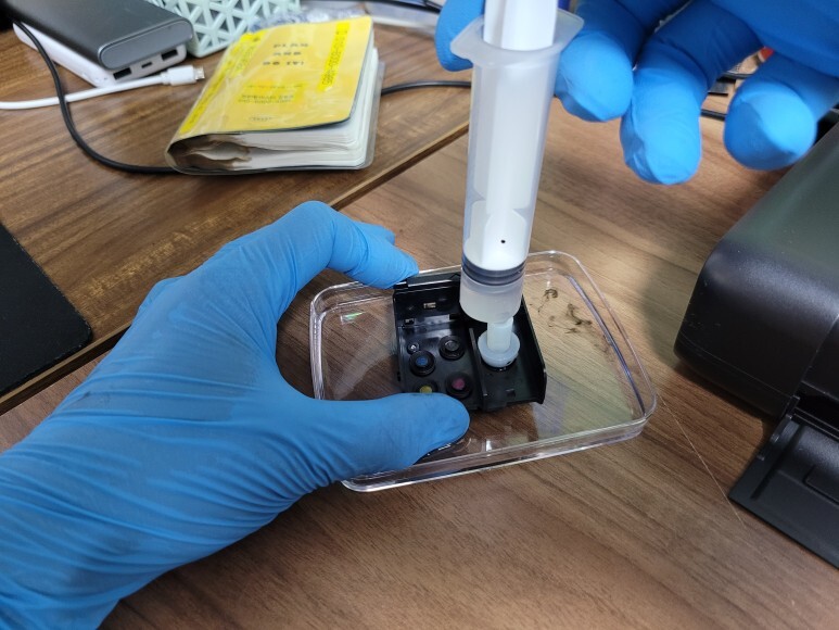 캐논 iP110 헤드의 블랙/칼라 카트리지 장착 주입구에 세정액을 소량 주입하여 노즐부로 잉크를 밀어내어 막힌 노즐을 세정했습니다.