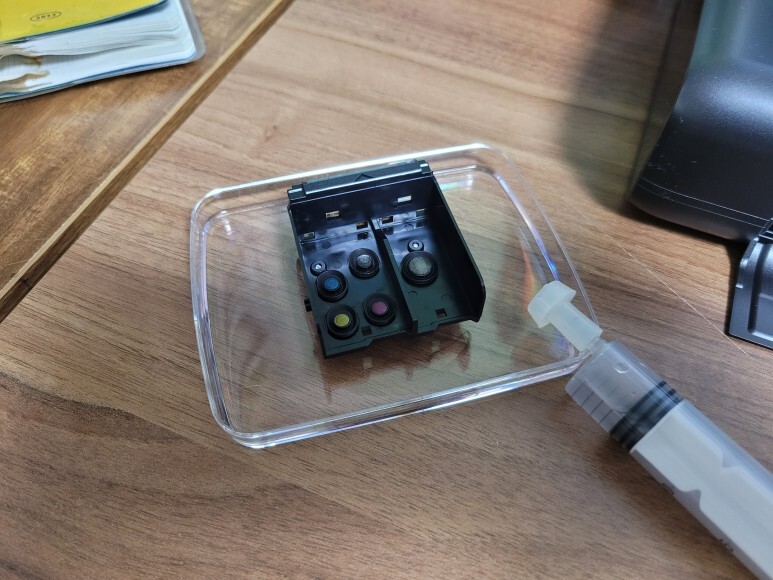 트레이에 세정을 아주 얇게 부어 캐논 iP110 헤드의 노즐부를 살짝 담가 두었습니다.
