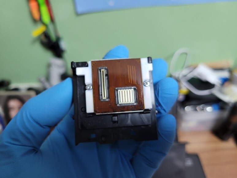레버를 올려 헤드를 빼서 오염된 잉크를 닦아냈습니다.