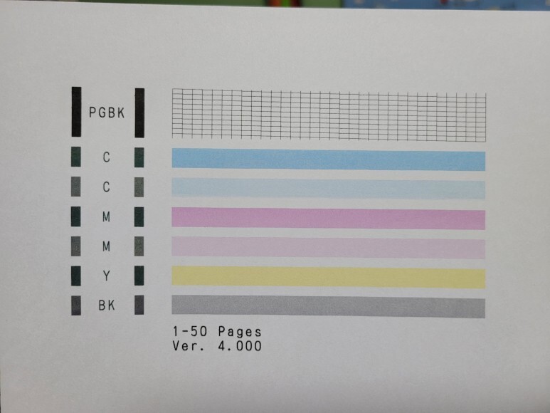 캐논 iP110 프린터 노즐 점검 출력 테스트 페이지를 출력하여 헤드 노즐 상태를 점검했습니다. 캐논 iP110 프린터의 출력상태는 아주 양호하게 출력되어 나왔습니다.