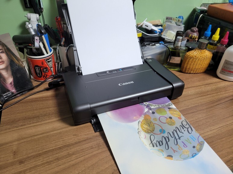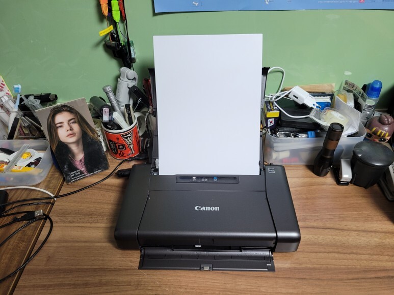 캐논 iP110 프린터에 헤드를 재장착하고 캐논 PGI-35 블랙 카트리지와 캐논 CLI-36 칼라 카트리지를 장착, 후면 급지대에 A4 용지를 삽입했습니다.