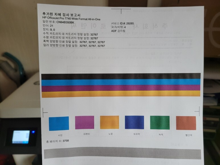 초기화 후에 정상적으로 헤드정렬페이지가 출력되어 나왔습니다. No Chip 전환 완료 후에 1회용 인증칩을 제거했습니다.