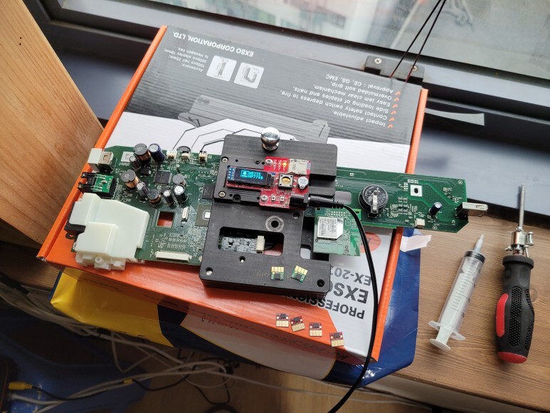 HP 7740 무한잉크가 출력되지 않고 있습니다. 온라인으로 구매한 유한 4칩이 카트리지에 부착되어 있었습니다.온라인으로 구매한 유한 4칩 카트리지로 칩을 모두 제거하였습니다.