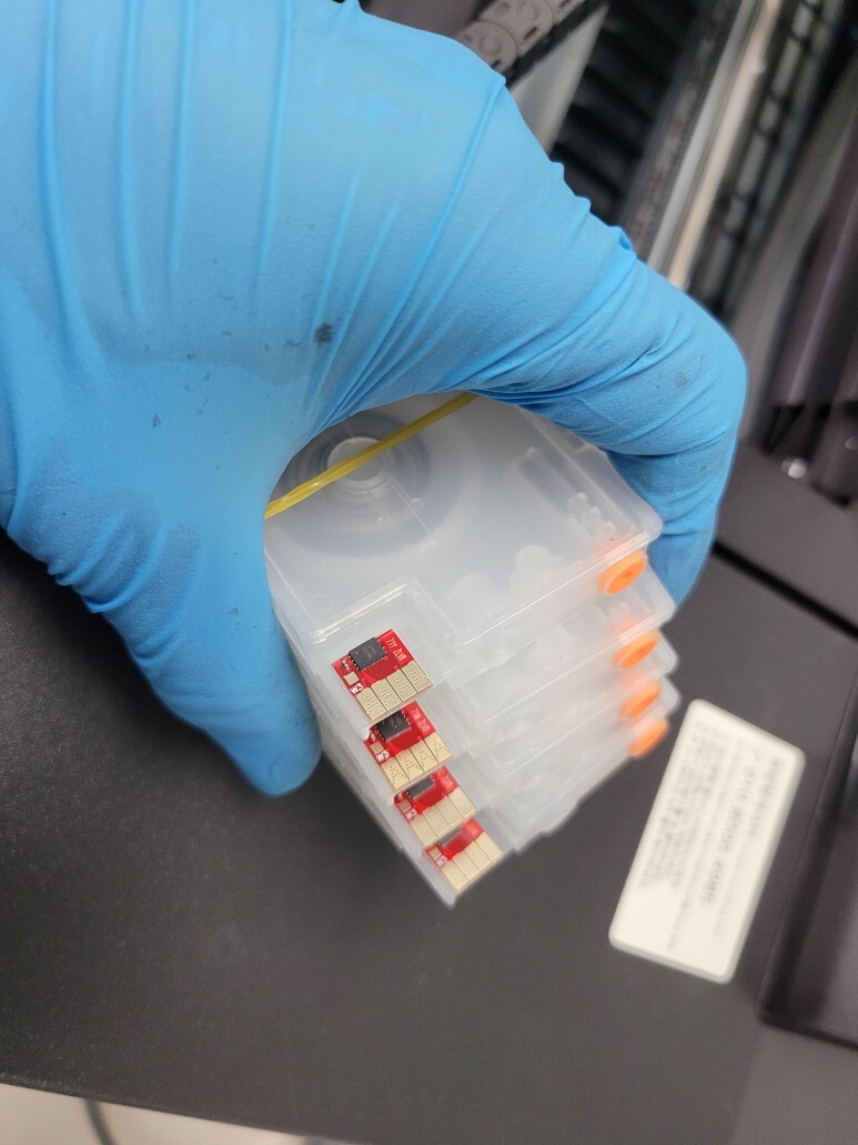 HP T120 24인치 플로터 대형프린터 카트리지를 호환 4칩과 새 금형카트리지로 교체 진행했습니다.