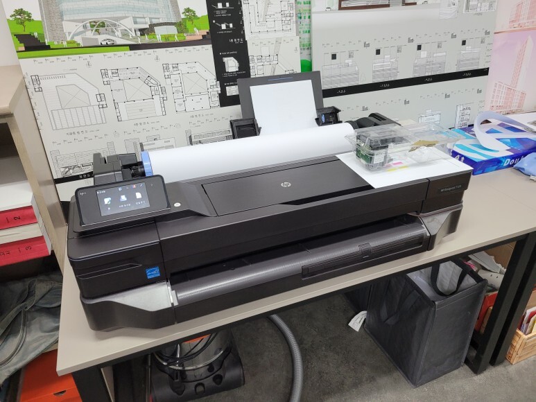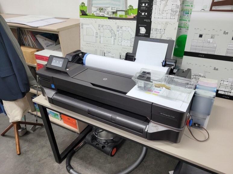 서울시 강남구 자곡동 소재 건축설재 사무실에서 HP T120 24인치 플로터 대형프린터 무한잉크 사용중인데 프린트헤드 문제 수리 요청, 스케줄 잡아 이동하여 수리 완료했습니다.