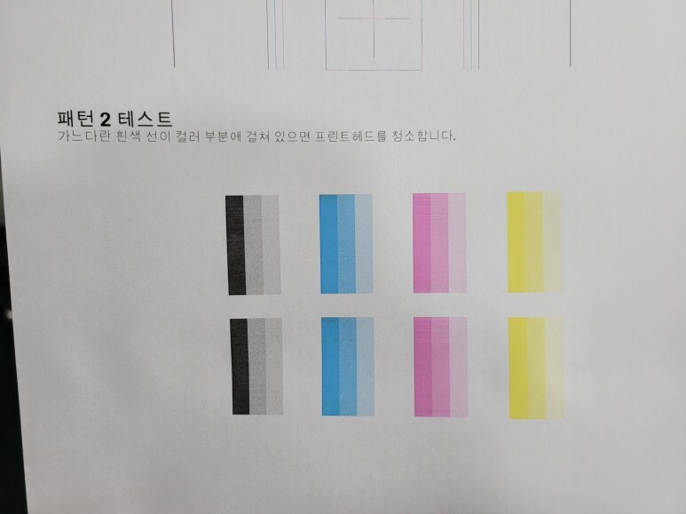 노랑색 출력 상태가 매우 불량했습니다. 색빠짐 현상으로 미세하게 노즐에 고지혈으로 혈액이 원활하게 순환되지 않는 것과 같습니다.