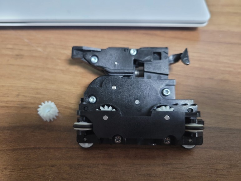 HP 디자인젯 T125 T525 플로터 커터 칼날 (CQ890-67091) 나사 4개를 풀어 커버를 열어 보니 칼날 기어에 크랙의 흔적이 보였습니다.