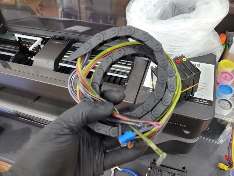 HP T120 24인치 A1 플로터 카트리지 패킹을 새걸로 교체하고 ㄱ자 피팅 포함 새로운 공급선으로 교체 했습니다. 신규 체인 및 체인받침대, 브라켓을 교체 부착했습니다.