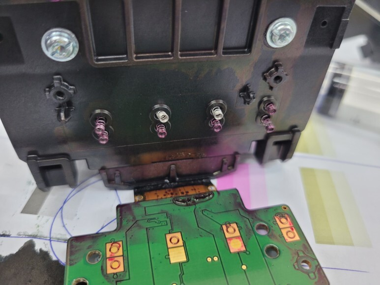 HP T120 플로터 헤드 PCB 기판이 심하게 오염되어 스프링을 모두 제거하고 크리닝 및 납쇼팅했습니다.