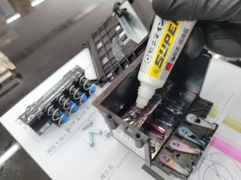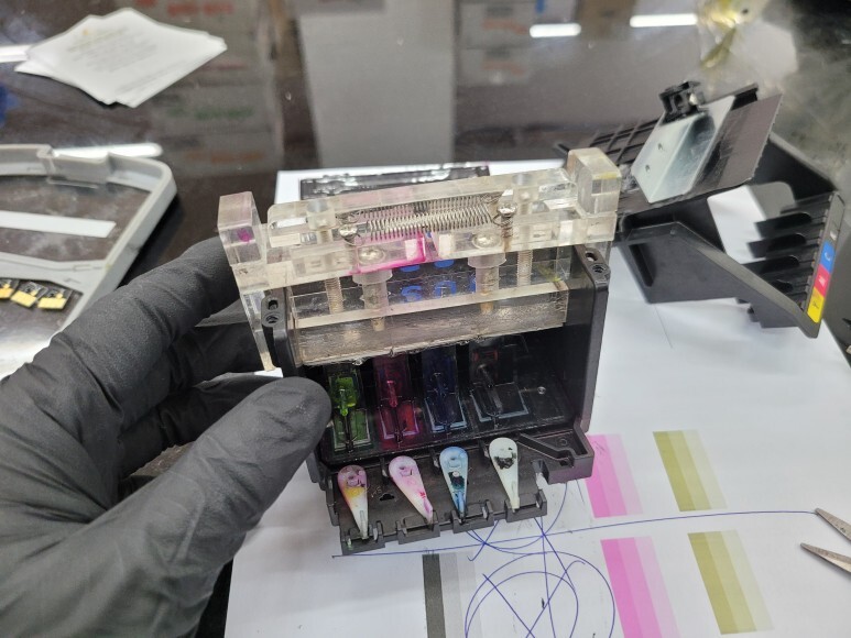 많이 훼손되고 오염된 카트리지를 크리닝하고 석션하여 호스 및 카트리지 내부에 잉크를 가득 채웠습니다.
