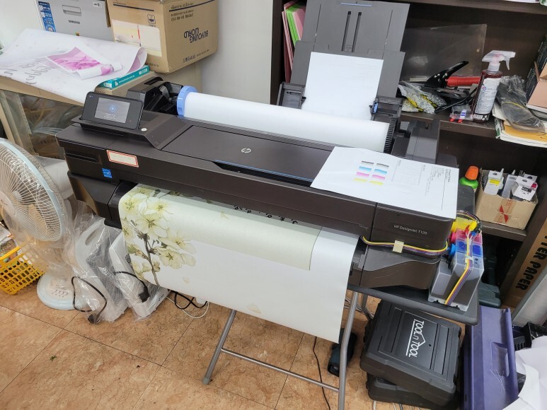 HP T120 24인치 A1 플로터가 잉크 카트리지 소모됨 문제로 멈춰 있었습니다. 전체적인 상황이 매우 불안하고 비 안정적으로 무한잉크가 장착되어 있었습니다. 이렇게 더 사용하면 비싼 치료비를 치뤄야 하므로 안정적 교체 처리해야 했습니다.