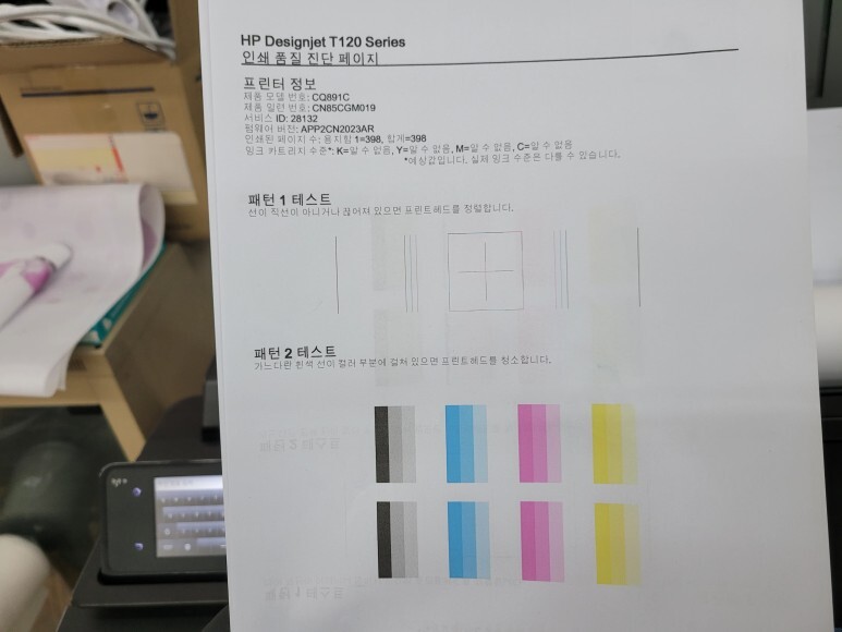 HP T120 플로터 헤드 노즐 점검을 위해 진단페이지를 출력해 확인했습니다.
