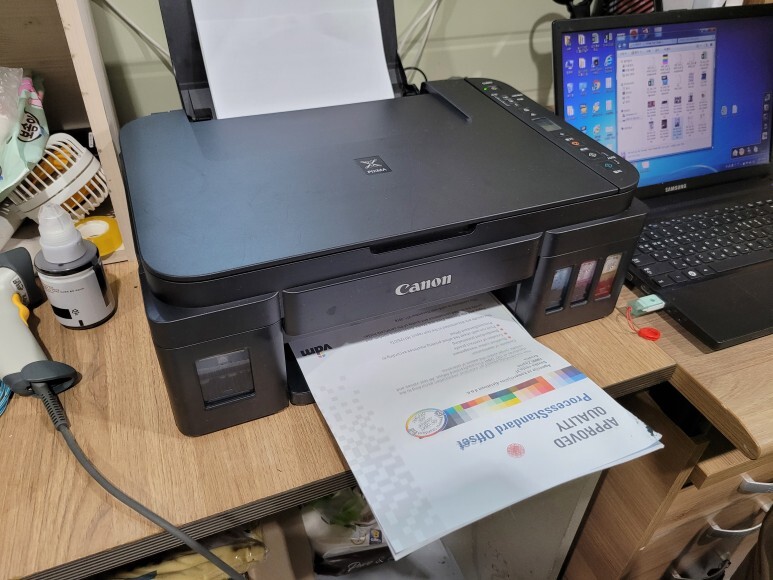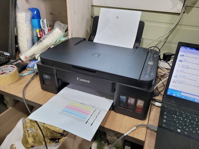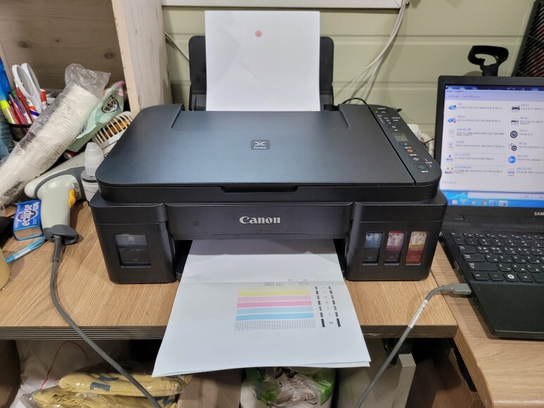 캐논 G3910 정품무한잉크 복합기 시스템 청소를 진행하여 호스 내부에 잉크를 가득 채우고 정상 출력되었습니다.