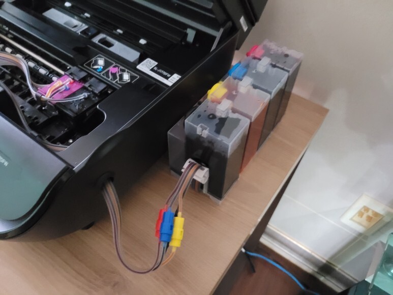 삼성 SL-1770FW 팩스복합기 카트리지에 호스를 연결, 타공된 홀로 호스를 내고 퀵차단밸브를 결합하여 무한잉크장치를 연결했습니다.