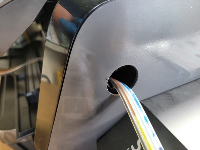 호스를 잘라 잉크 퀵차단밸브를 장착, 하우징 타공하여 호스를 밖으로 빼서 공급기와 퀵차단밸브 결합, 연결했습니다.