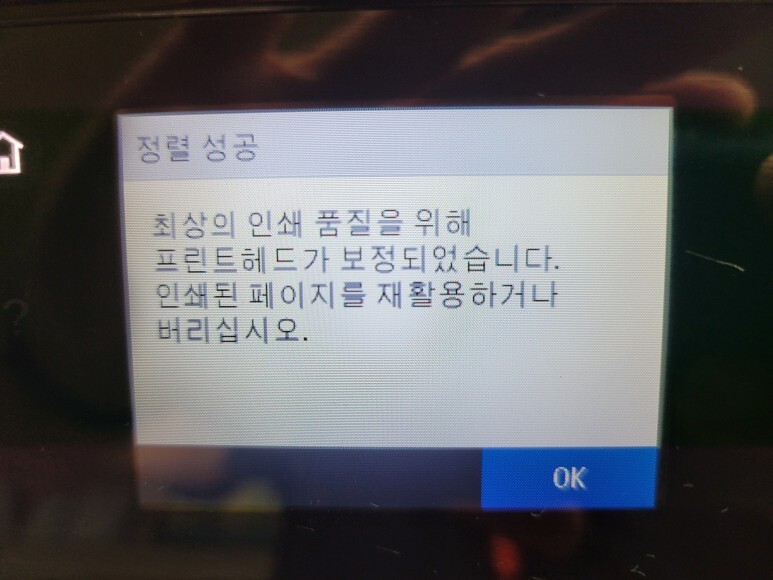 초기화 후에 정상적으로 헤드정렬페이지가 출력되어 나왔습니다. No Chip 전환 완료 후에 1회용 인증칩을 제거했습니다.