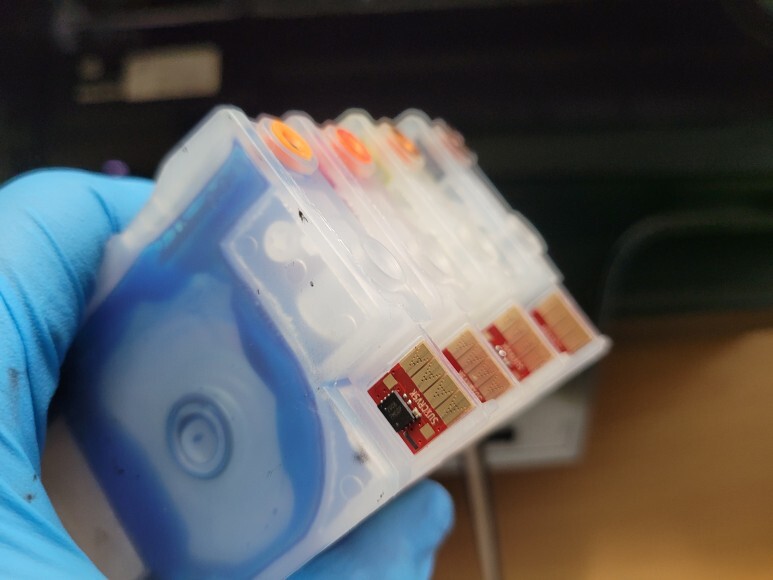 카트리지 잉크 석션하여 호스 및 카트리지 내부에 잉크를 가득 채웠습니다. 카트리지 내부에 가득 채운 카트리지에 No Chip 인증칩을 부착(추후 폐기) 메탈클램프 핫멜트보강하고 카트리지를 헤드에 재장착했습니다.