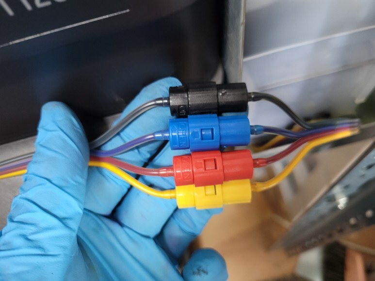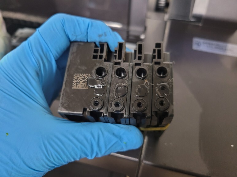 퀵차단밸브 장착 후 잉크 공급기와 결합, 카트리지 잉크 석션하여 호스 및 카트리지 내부에 잉크를 가득 채우고 셋업처리된 HP 711 헤드를 교체, 카트리지를 장착했습니다.