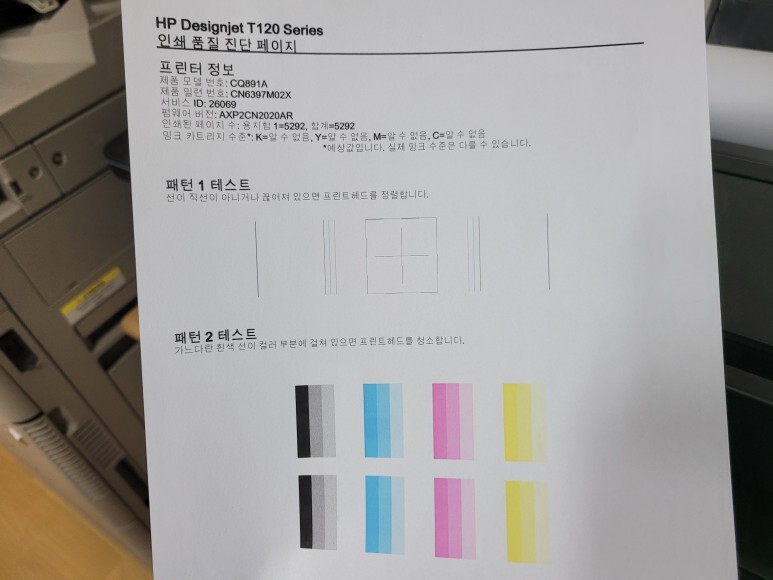 HP T120 24인치 대형프린터 A1 플로터 무한잉크 헤드 노즐 점검을 위해 진단페이지를 출력해 확인했습니다.