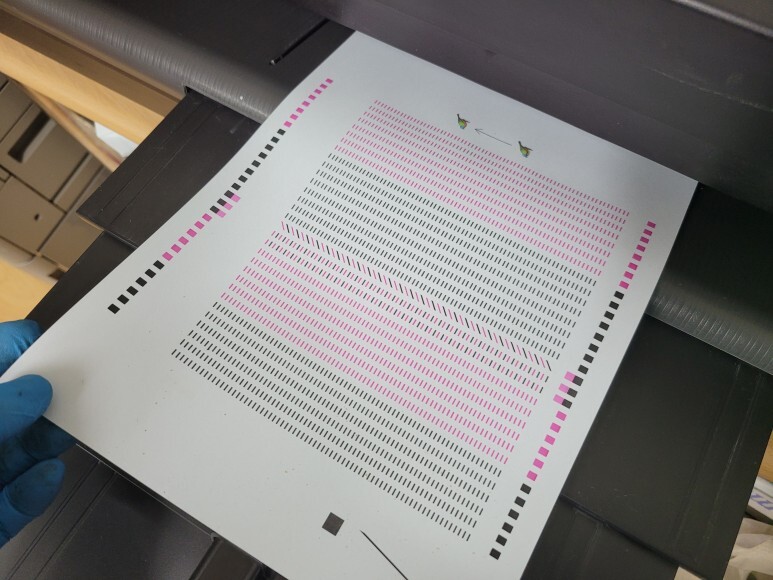 HP T120 24인치 A1 플로터 헤드 교체 후에 정상적으로 헤드 정렬 페이지가 출력되어 나왔습니다.