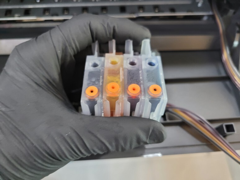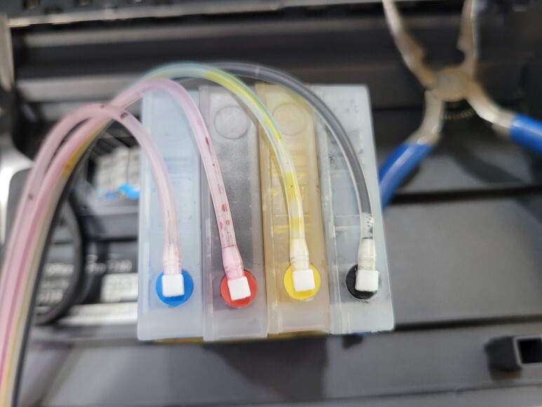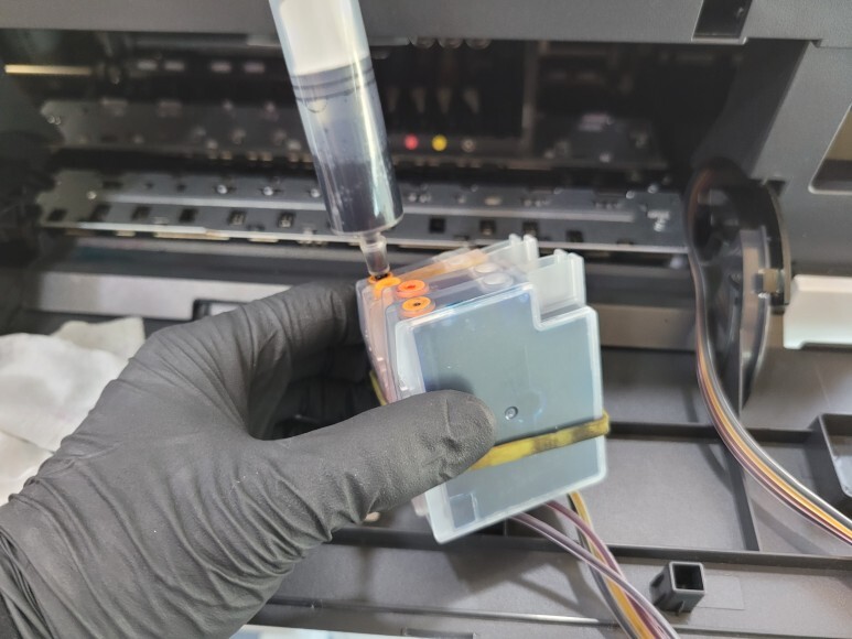HP 오피스젯 7740 무한잉크 A3 팩스복합기 카트리지 잉크 석션하여 호스 및 카트리지 내부에 잉크를 가득 채웠습니다.