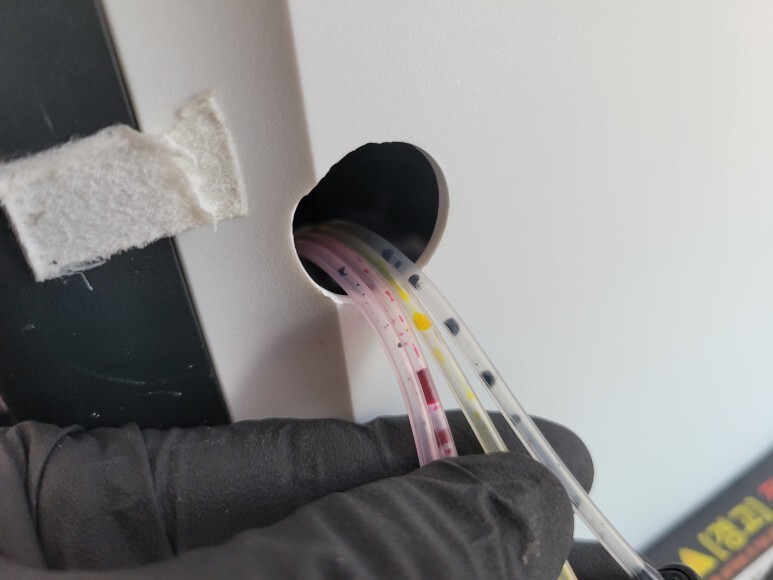 우선 호스를 잘라 공급기 및 카트리지 호스 라인에 잉크 퀵차단밸브를 장착했습니다.