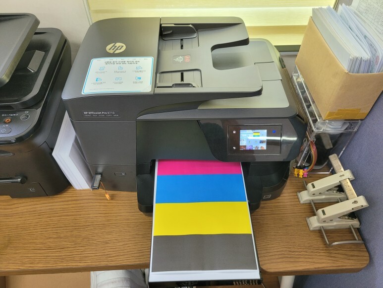 HP 8710 팩스복합기 무한잉크의 사무실에서 사용량이 덜한 노랑색의 출력상태가 좋지 않았습니다.