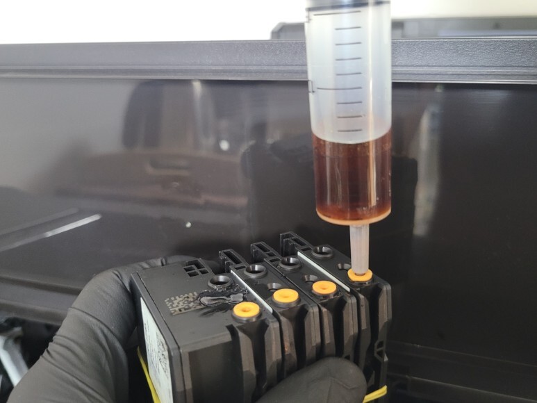 HP T120 24인치 카트리지를 석션하여 호스 및 카트리지 내부에 잉크를 가득 채웠습니다.
