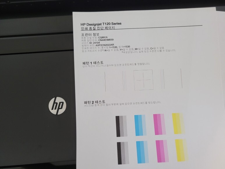 HP T120 24인치 대형프린터 A1 플로터 무한잉크 헤드 노즐 점검을 위해 진단페이지를 출력해 확인했습니다.