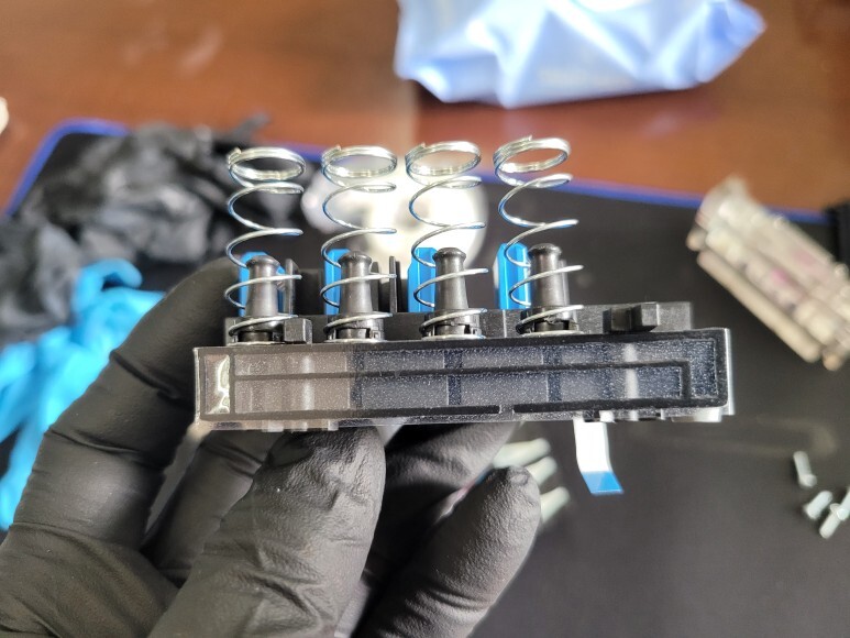 HP T120 24인치 플로터의 HP 711 헤드 챔버에 테이핑 보강한 후에 챔버 보호 지그를 눌러 양생했습니다.
