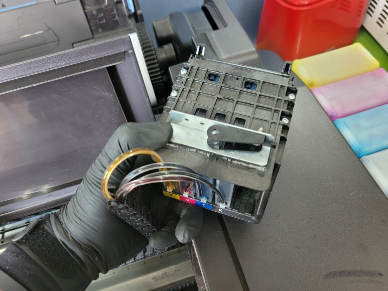 HP T120 24인치 플로터의 HP 711 헤드에 체인받침대 및 브라켓 부착 후 카트리지를 삽입했습니다.