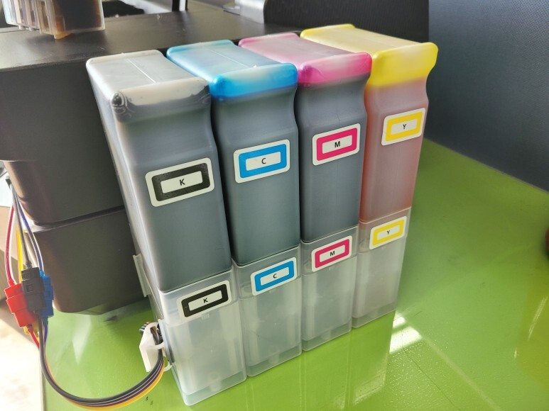 HP T120 24인치 플로터에 색당 500ml 공급장치 장착 및 카트리지에 호스를 연결해 장착했습니다.