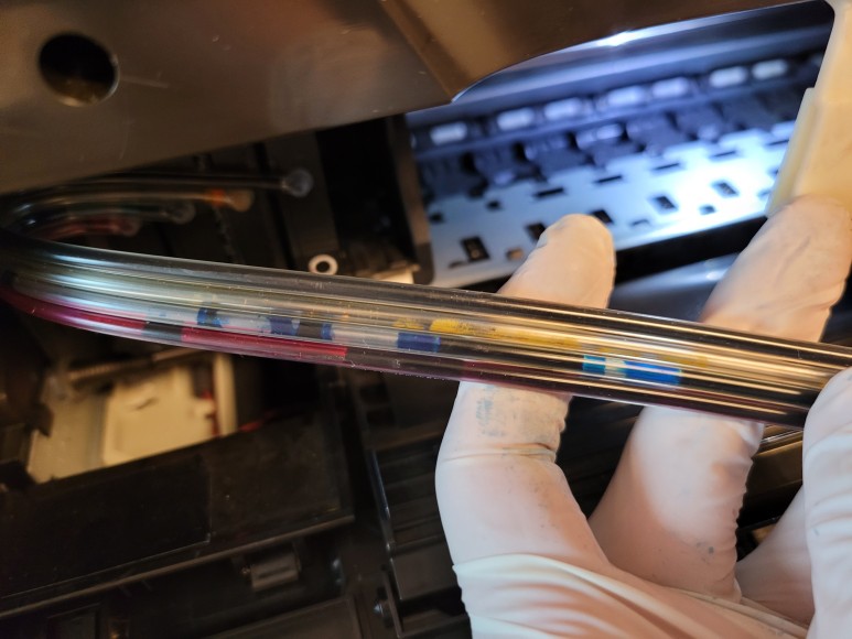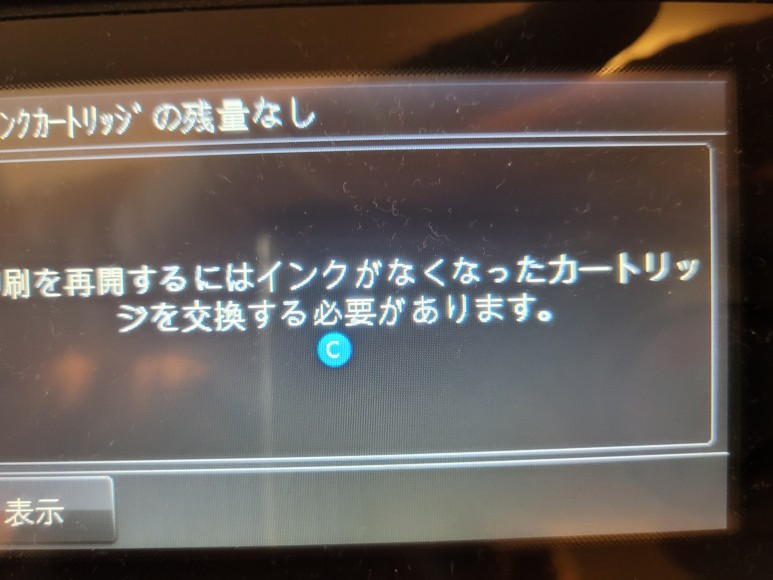 언어설정은 일본어, 잉크 카트리지 소모됨 에러 및 공급선, 호스 내부에 잉크가 심하게 빠져 있었습니다.