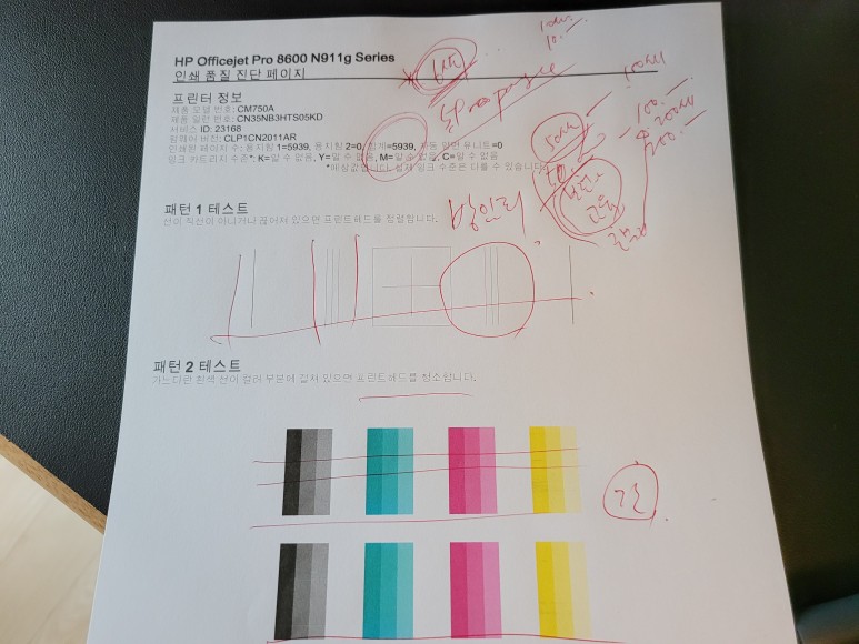 헤드 노즐 점검을 위해 인쇄 품질 진단 페이지를 출력했습니다.인쇄 품진 점검 페이지를 출력하여 노즐 상태를 점검하였습니다.