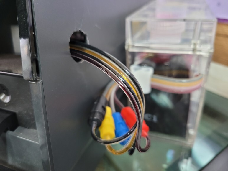 HP 8610 팩스복합기 무한잉크 타공하여 공급선을 밖으로 빼고 잉크 퀵차단밸브를 장착, 외부 무한잉크 공급기와 결합했습니다.