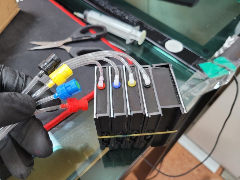 HP 8610 팩스복합기 무한잉크 고무 패킹을 잘 찢어지지 않는 재질로 새로 교체했습니다. 국산 ㄱ자 피팅 및 가볍고 부드러운 공급선으로 교체, 장착했습니다.