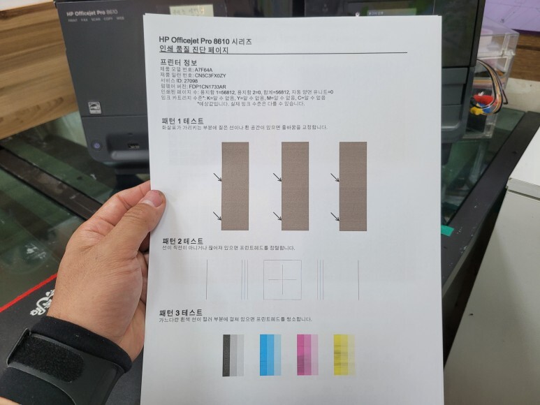 노즐 점검을 위해 인쇄 품질 진단 페이지를 출력 확인했습니다.