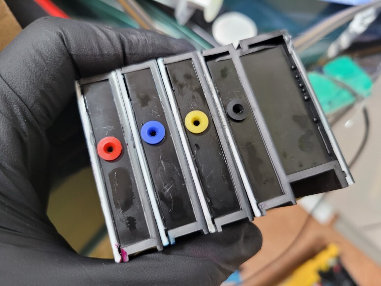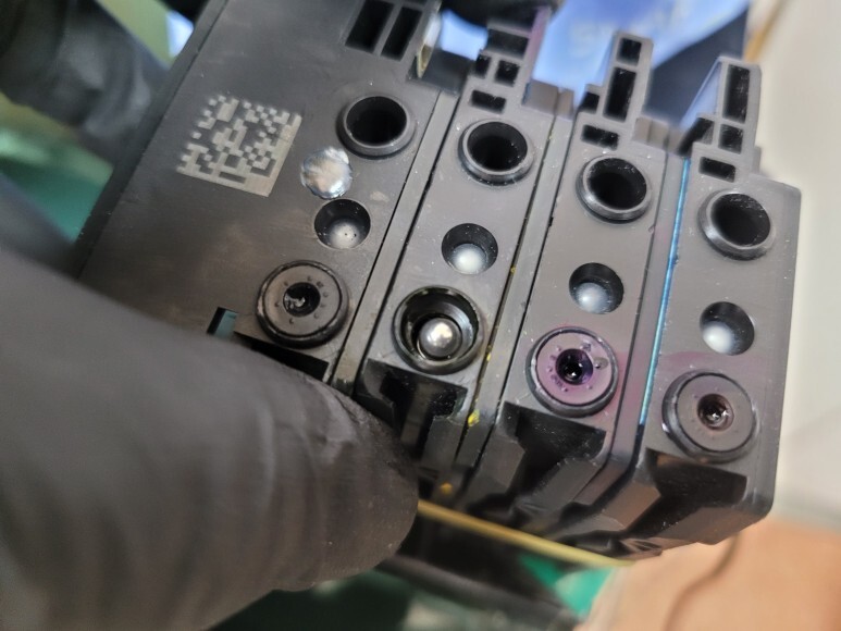 헤드에 메탈클램프 부착 및 핫멜트 보강, 호스를 단단히 고정하고 카트리지 석션하여 호스 및 카트리지 내부에 잉크를 가득 채우고 헤드에 재장착했습니다.