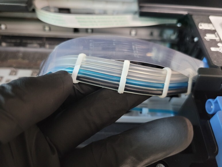 약 10분정도 잉크 시스템 세척을 진행했습니다. 많은 량의 잉크가 호스 및 카트리지(헤드) 안으로 정상적으로 가득 채워졌습니다.