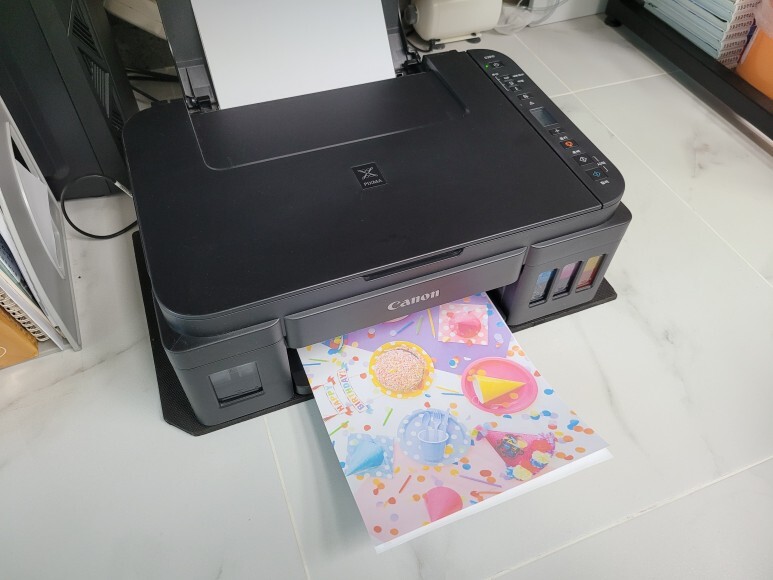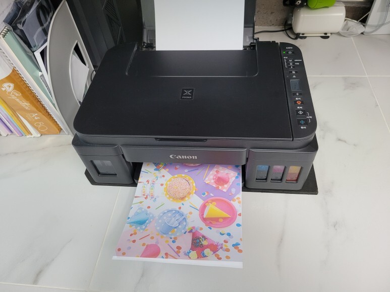 CANON G3910 복합기에서 노즐 점검 페이지를 눌러 전 색상 정상적으로 출력되어 나왔습니다. 약 1,900장 정도 사용되었네요.