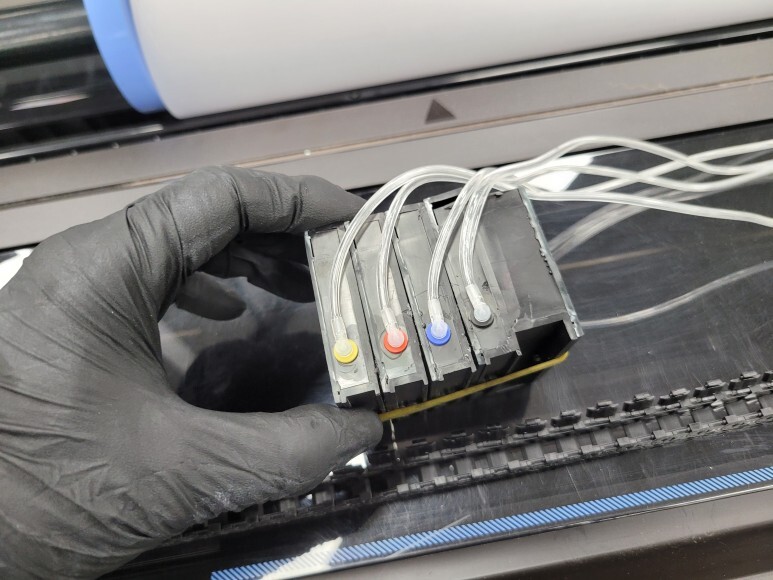 잉크 석션된 카트리지를 헤드에 삽입하고 헤드를 HP T520 36인치 플로터 무한잉크 대형프린터에 장착했습니다.