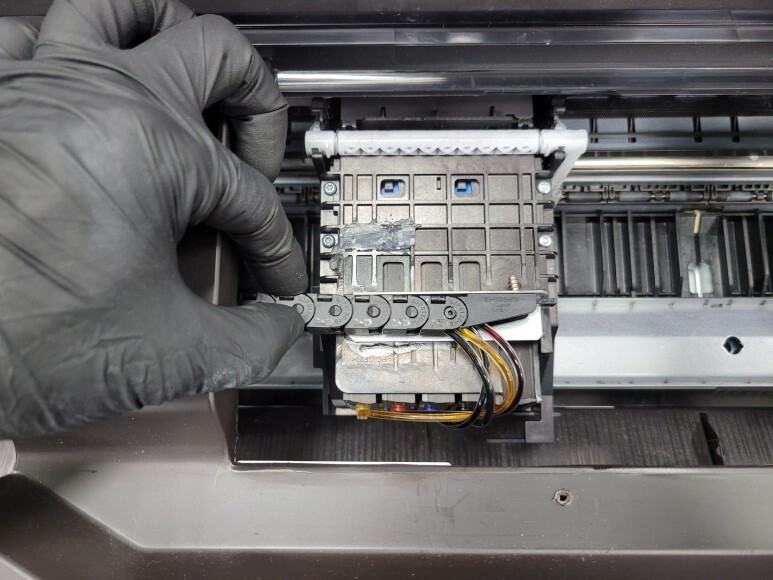 HP T520 36인치 플로터 무한잉크 대형프린터에서 기존 구동에 문제되는 무겁고 두꺼운 호스 및 심하게 훼손하며 부착된 브라켓 및 받침대를 무도 제거하고 하우징 덮개를 여니 파지도 있었습니다.