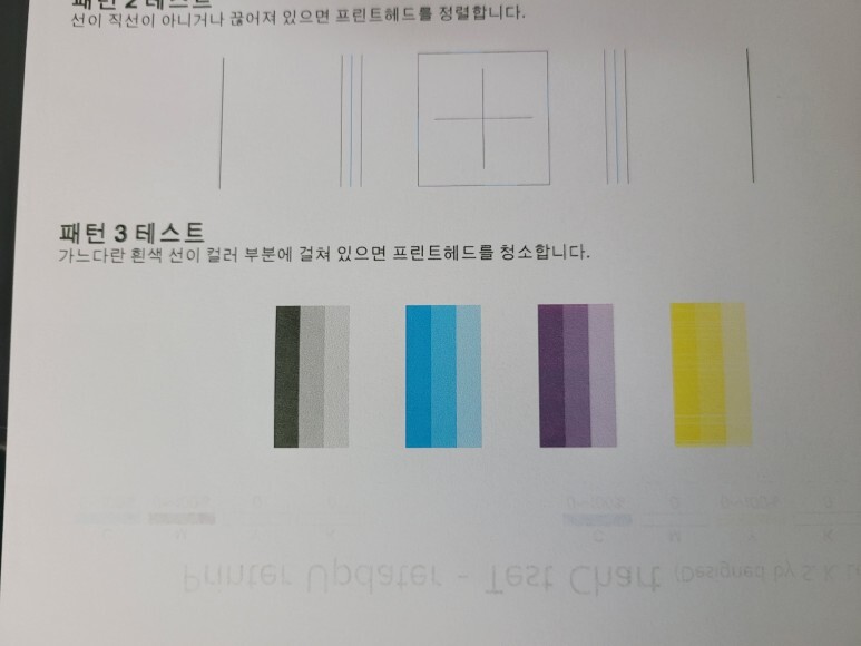 노즐 점검을 위해 인쇄 품질 진단 페이지를 출력 확인했습니다.