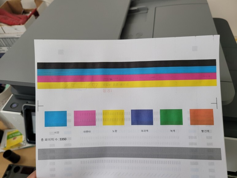 HP 9010 팩스복합기 무한잉크 노즐 점검을 위해 인쇄 품질 진단 페이지를 출력 확인했습니다.