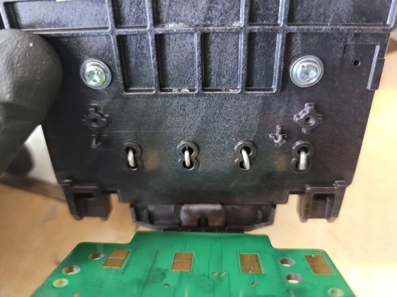 HP 9010 팩스복합기 무한잉크 프린터의 헤드를 분해해서 칩판부를 보니 잉크 오염 및 비닐 접착이 떨어져 있었습니다.