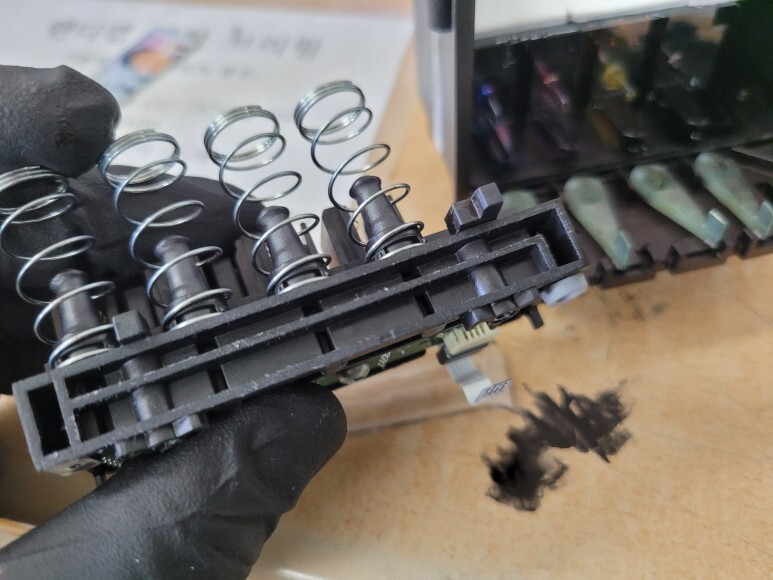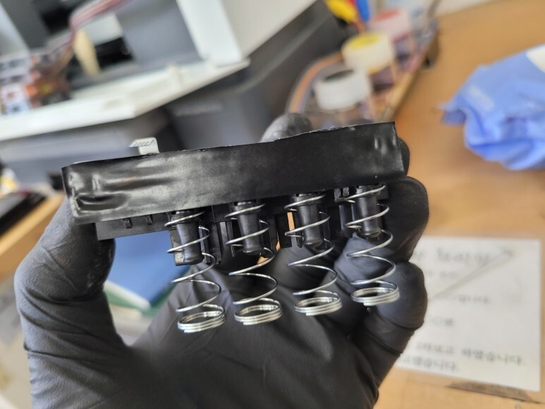 HP 9010 팩스복합기 무한잉크 프린터 헤드 칩판부를 개방하고 오염 크리닝 후, 스프링을 모두 제거하고 납 쇼팅했습니다.