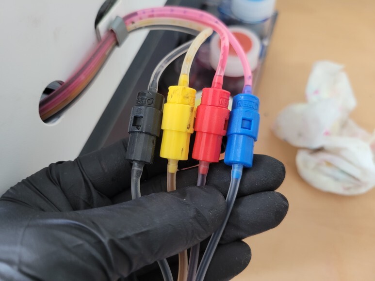 HP 9010 팩스복합기 무한잉크 프린터 하우징 타공 및 퀵차단밸브 장착, 외부 무한잉크 공급장치와 연결 했습니다. 카트리지 잉크 석션하여 호스 및 카트리지 내부에 잉크를 가득 채웠습니다.