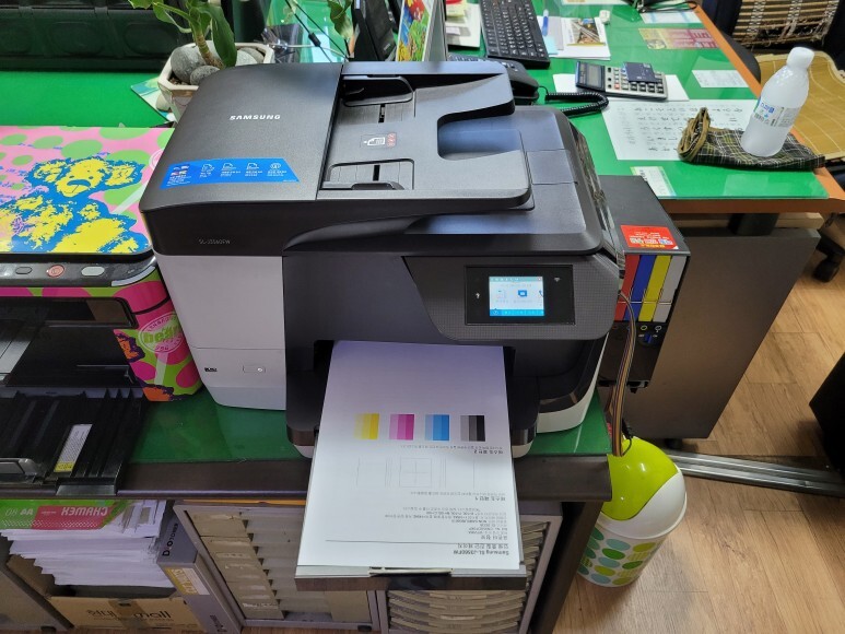 삼성 SL-J3560FW 무한잉크 호스를 잘라 잉크 퀵차단밸브를 장착하여 No Chip 용 카트리지로 교체하고 삼성 SL-J3560FW 하우징을 타공하여 호스를 밖으로 배출했습니다. 삼성 SL-J3560FW 카트리지 석션하여 호스 및 카트리지 내부에 잉크를 가득 채우고, 인증칩을 부착했습니다. (인증 후 폐기) 삼성 SL-J3560FW 헤드에 메탈크램프를 부착하고 핫멜트 보강, 헤드에 장착하여 호스를 단단히 잡아주고 말끔하게 정리하였습니다.