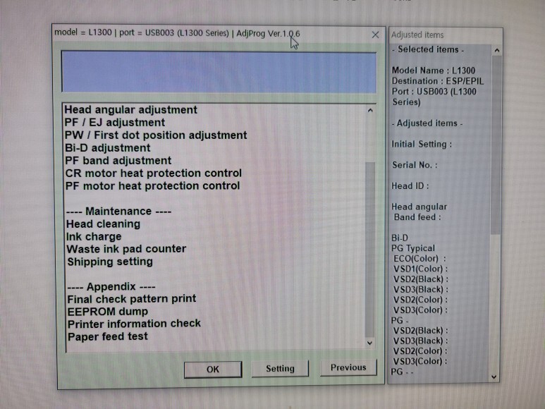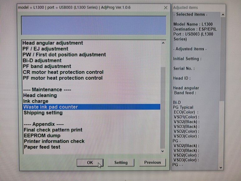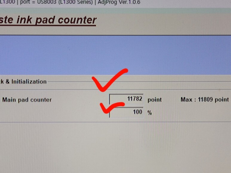 엡손 정품무한 L1300 A3 프린터 Adjustment Program에서 Waste Ink Pad Counter를 실행했습니다.