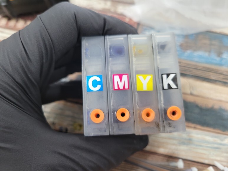 HP 7740 팩스복합기 A3 무한잉크 프린터의 잉크 공급선을 재단하여 훼손된 부위를 자르고 폐기, ㄱ자 피팅을 새로 교체하여 호스를 연결, 석션하여 호스 및 카트리지 내부에 잉크를 가득 채웠습니다.